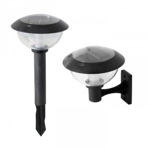 #2 bornes solaires murales et sol Matériaux : PlastiqueUtilisation : Extérieur Alimentation SolaireType d'ampoule : LED 2 Positions (mur et sol), livré avec coude mural Hauteur sol 44 cm, Ø 16 cm